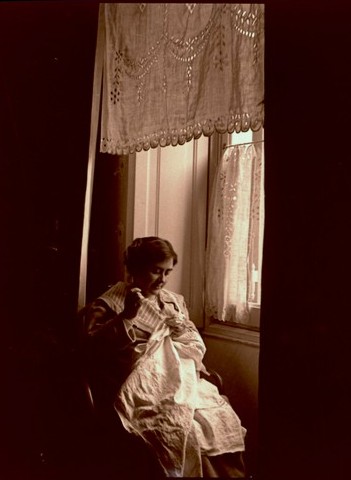 Paola Franzoni (Lina) che cuce alla finestra
