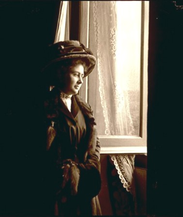 Paola Franzoni (Lina) che cuce alla finestra